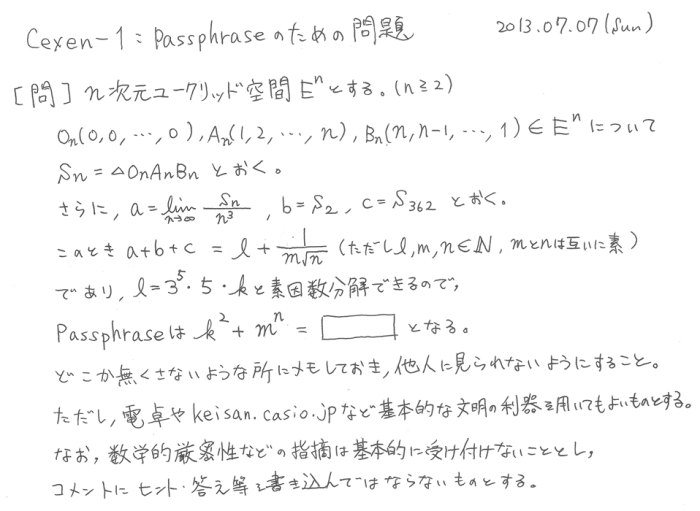 cexen-1: Passphraseのための問題①(旧) cexen 2013.07.07(Sun) Question Answer The Answer of this article is secret. Passphrase: (Passphrase知らない人はCexen-3: Passphraseのための問題②でどうぞ) Comments The Comments of this article are secret. Passphrase: (Passphrase知らない人はCexen-3: Passphraseのための問題②でどうぞ)