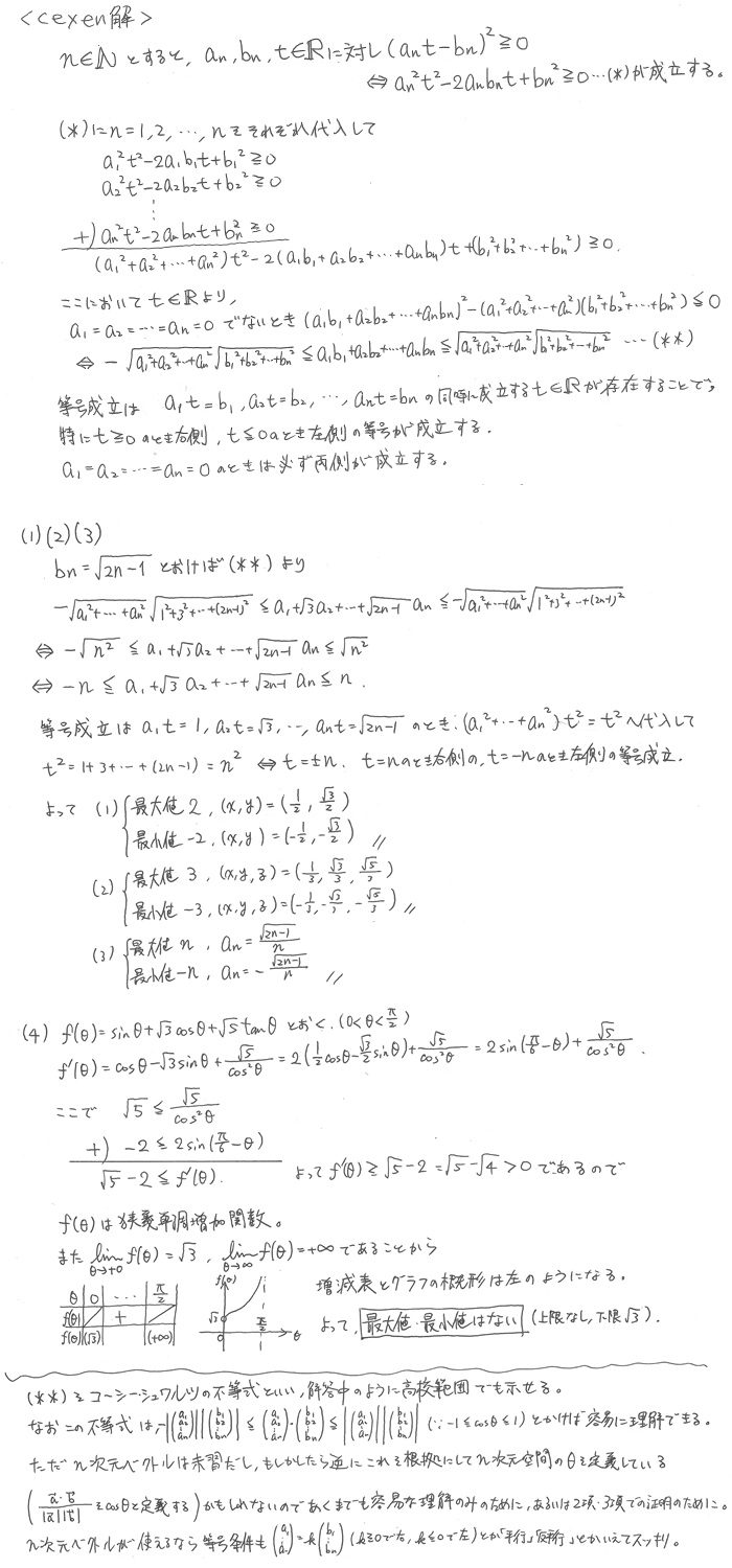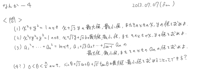 なんか-4: 条件付きn個の文字の最大・最小 なんか 2013.07.07(Sun) Question Answer Comments 2 cexen 解答中の増減表は↗が抜けてますね 2013.07.11(Thu) 10:39.43 Name: Passphrase: Comment: (Passphrase知らない人はCexen-3: Passphraseのための問題②でどうぞ)