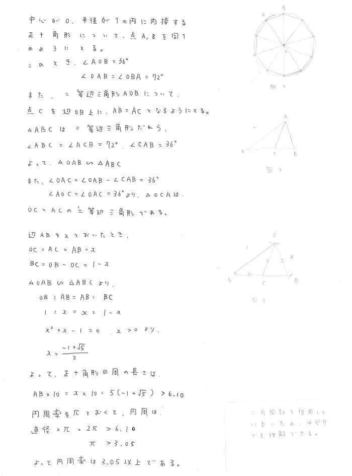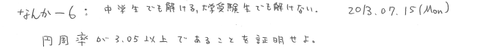 なんか-6: 中学生でも解ける,大学受験生でも解けない. なんか 2013.07.15(Mon) Question Answer Comments 12 cexen 東京大学2003年入試問題前期数学理科第6問で,実際の文言は「円周率が 3.05 より大きいことを証明せよ.」 2013.09.22(Sun) 18:52.14 Name: Passphrase: Comment: (Passphrase知らない人はCexen-3: Passphraseのための問題②でどうぞ)