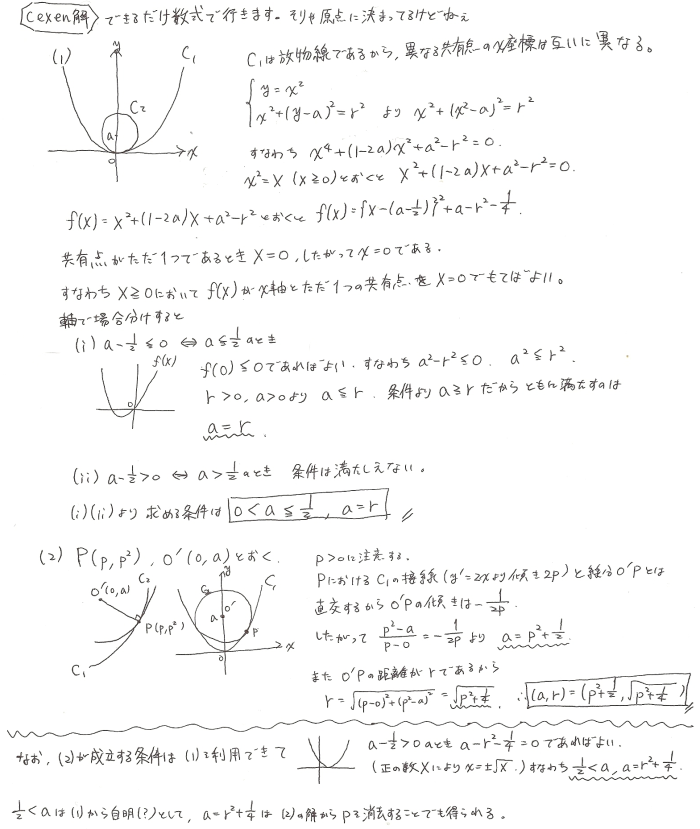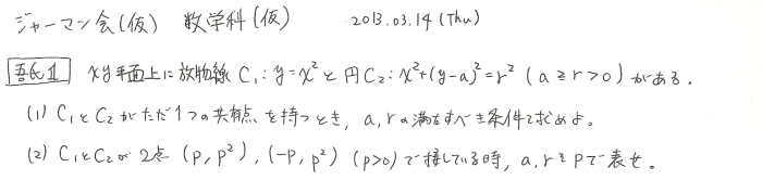 吾-1: 放物線と接する円 吾 2013.07.07(Sun) Question Answer Comments 6 cexen 難易度A** 2013.08.29(Thu) 01:15.53 Name: Passphrase: Comment: (Passphrase知らない人はCexen-3: Passphraseのための問題②でどうぞ)