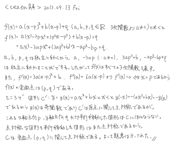 吾-6: 3次関数の点対称性 吾 2013.09.13(Fri) Question 3次関数f(x)で表される曲線C:y=f(x)は点対称な図形であることを示せ。 Answer Comments 11 cexen y=ax^3+bx^2+cx+dをx軸方向b/3aだけ平行移動してもよい.(理由は立法完成すればすぐにわかる.) 2013.09.13(Fri) 22:24.11 Name: Passphrase: Comment: (Passphrase知らない人はCexen-3: Passphraseのための問題②でどうぞ)